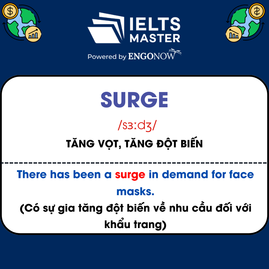 - Surge /sɜːdʒ/: Tăng vọt, tăng đột biến